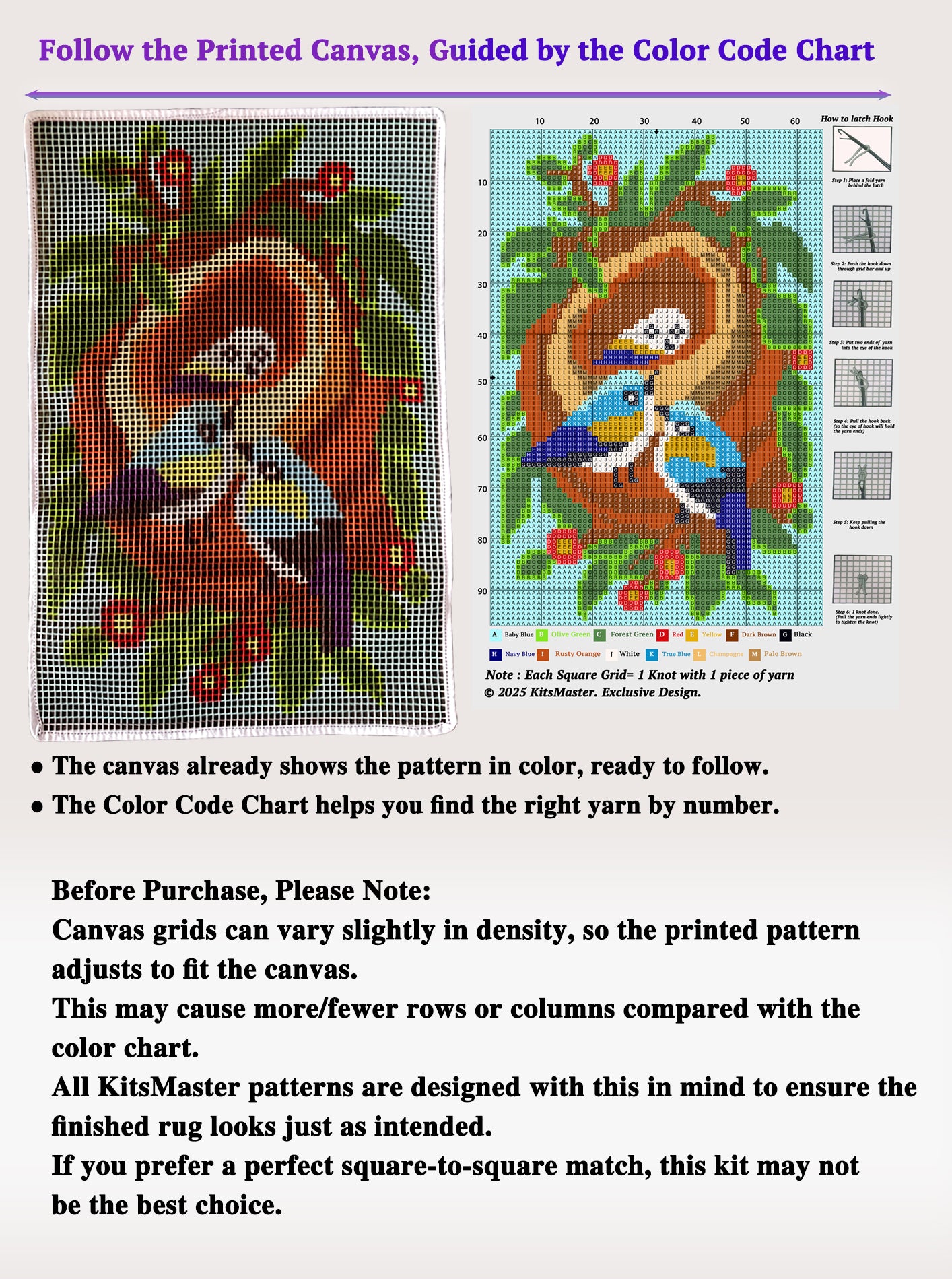 [Complete DIY Latch Hook Kit] – Includes everything you need: pre-printed canvas, soft acrylic yarns, easy-to-hold latch hook tool, color guide, and step-by-step instructions for beginners.